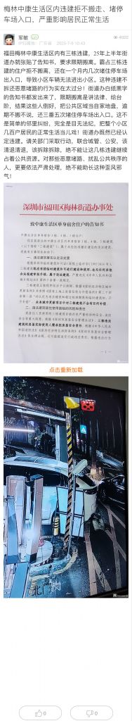 35. 帖文《梅林中康生活區(qū)內(nèi)違建拒不搬走、堵停車場入口,嚴(yán)重影響居民正常生活》