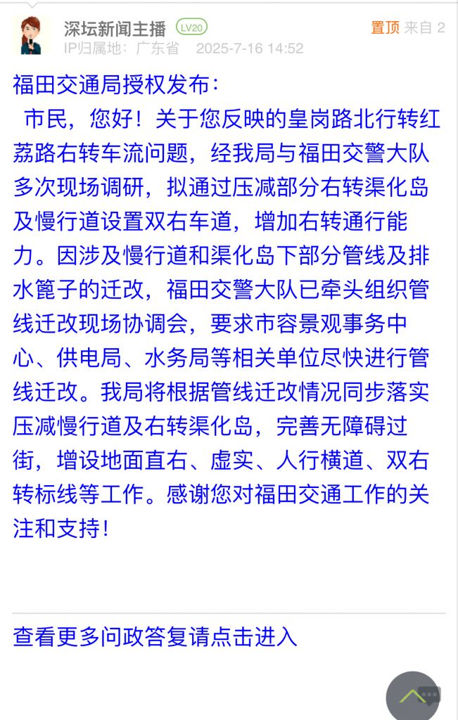 市民,您好!關(guān)于您反映的皇崗路北行轉(zhuǎn)紅荔路右轉(zhuǎn)車流問題,經(jīng)我局與福田交警大隊多次現(xiàn)場調(diào)研,擬通過壓減部分右轉(zhuǎn)渠化島及慢行道設(shè)置雙右車道,增加右轉(zhuǎn)通行能力。因涉及慢行道和渠化島下部分管線及排水篦子的遷改,福田交警大隊已牽頭組織管線遷改現(xiàn)場協(xié)調(diào)會,要求市容景觀事務(wù)中心、供電局、水務(wù)局等相關(guān)單位盡快進(jìn)行管線遷改。我局將根據(jù)管線遷改情況同步落實壓減慢行道及右轉(zhuǎn)渠化島,完善無障礙過街,增設(shè)地面直右、虛實、人行橫道、雙右轉(zhuǎn)標(biāo)線等工作。感謝您對福田交通工作的關(guān)注和支持!