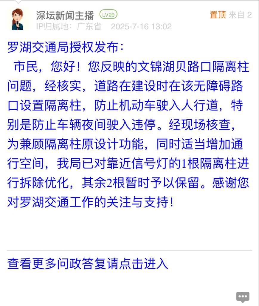 市民,您好!您反映的文錦湖貝路口隔離柱問題,經(jīng)核實,道路在建設(shè)時在該無障礙路口設(shè)置隔離柱,防止機動車駛?cè)肴诵械?,特別是防止車輛夜間駛?cè)脒`停。經(jīng)現(xiàn)場核查,為兼顧隔離柱原設(shè)計功能,同時適當(dāng)增加通行空間,我局已對靠近信號燈的1根隔離柱進(jìn)行拆除優(yōu)化,其余2根暫時予以保留。感謝您對羅湖交通工作的關(guān)注與支持!
