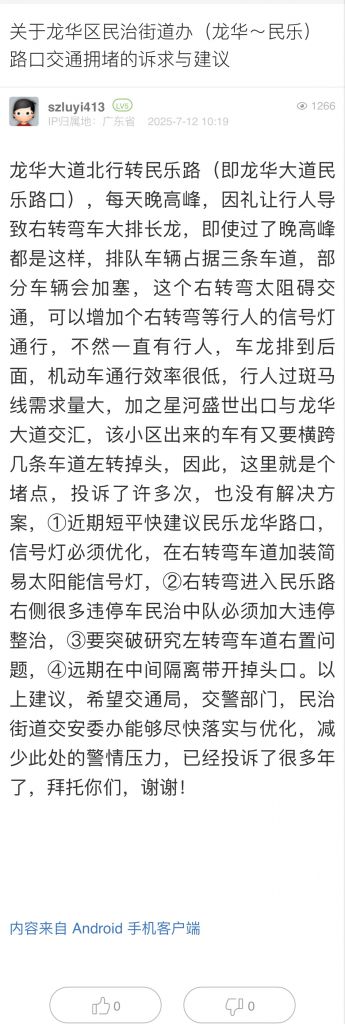 26. 帖文《關(guān)于龍華區(qū)民治街道辦(龍華~民樂)路口交通擁堵的訴求與建議》