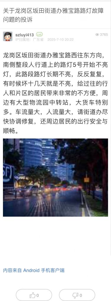 21. 帖文《關(guān)于龍崗區(qū)坂田街道辦雅寶路路燈故障問題的投訴》《路燈不亮問題反復(fù)反映多年問題的訴求與建議》