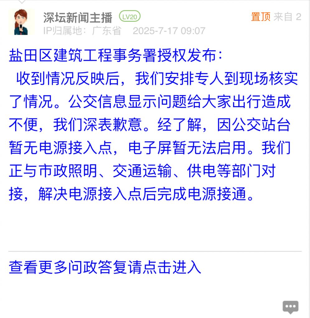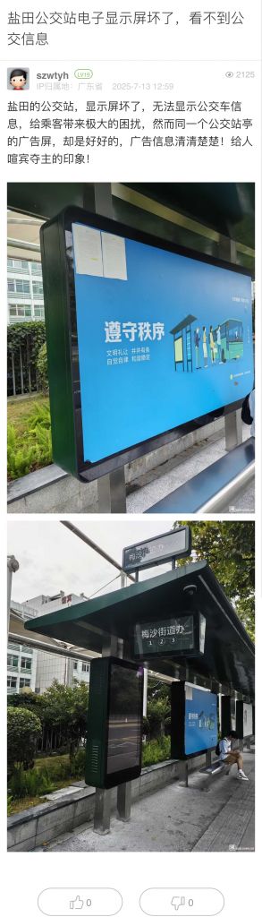 32. 帖文《鹽田公交站電子顯示屏壞了,看不到公交信息》