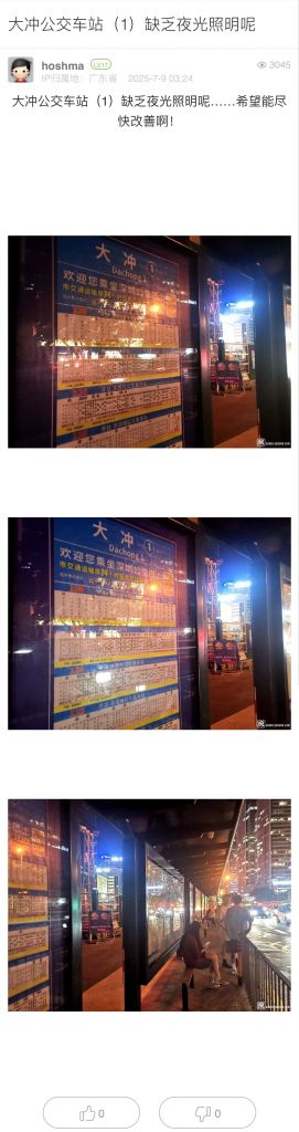 34. 帖文《大沖公交車站(1)缺乏夜光照明呢》