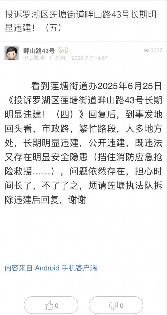 4. 帖文《投訴羅湖區(qū)蓮塘街道畔山路43號長期明顯違建?。ㄎ澹?/a>》