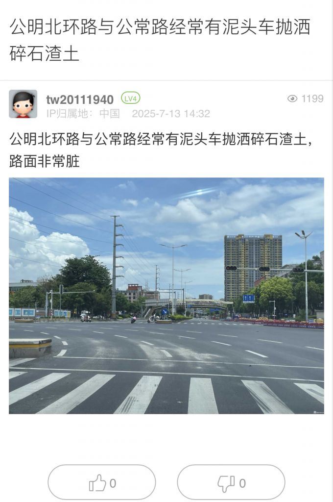 29. 帖文《公明北環(huán)路與公常路經(jīng)常有泥頭車拋灑碎石渣土》