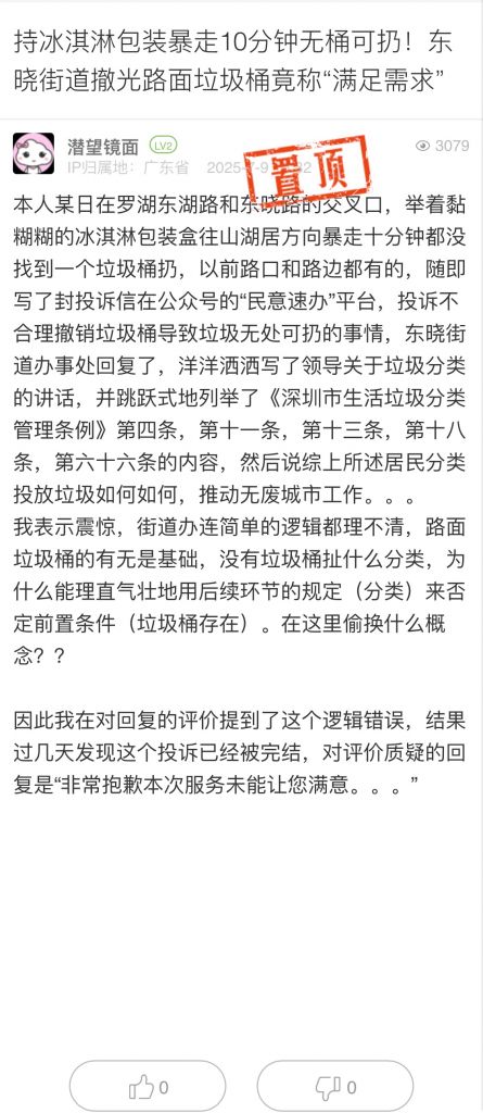 14. 帖文《持冰淇淋包裝暴走10分鐘無桶可扔!東曉街道撤光路面垃圾桶竟稱“滿足需求”》
