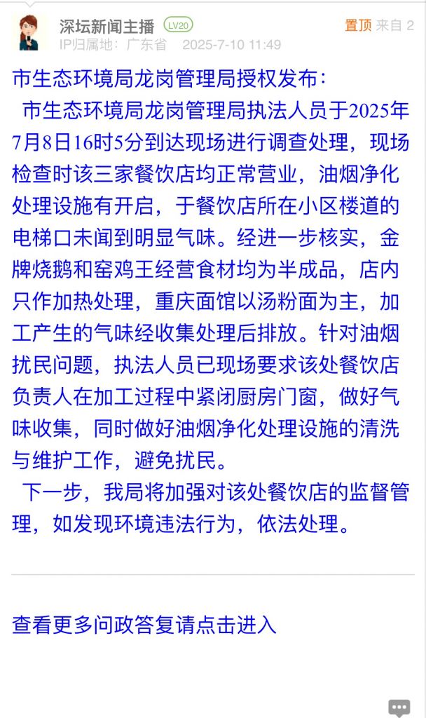 市生態(tài)環(huán)境局龍崗管理局執(zhí)法人員于2025年7月8日16時5分到達(dá)現(xiàn)場進(jìn)行調(diào)查處理,現(xiàn)場檢查時該三家餐飲店均正常營業(yè),油煙凈化處理設(shè)施有開啟,于餐飲店所在小區(qū)樓道的電梯口未聞到明顯氣味。經(jīng)進(jìn)一步核實,金牌燒鵝和窯雞王經(jīng)營食材均為半成品,店內(nèi)只作加熱處理,重慶面館以湯粉面為主,加工產(chǎn)生的氣味經(jīng)收集處理后排放。針對油煙擾民問題,執(zhí)法人員已現(xiàn)場要求該處餐飲店負(fù)責(zé)人在加工過程中緊閉廚房門窗,做好氣味收集,同時做好油煙凈化處理設(shè)施的清洗與維護(hù)工作,避免擾民。