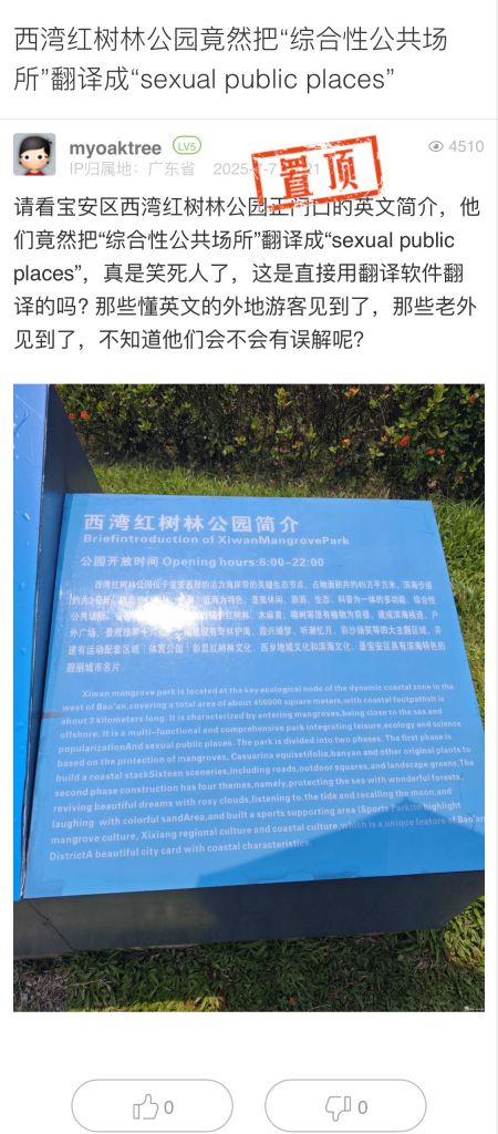 1. 帖文《西灣紅樹林公園竟然把“綜合性公共場所”翻譯成“sexual public places”》