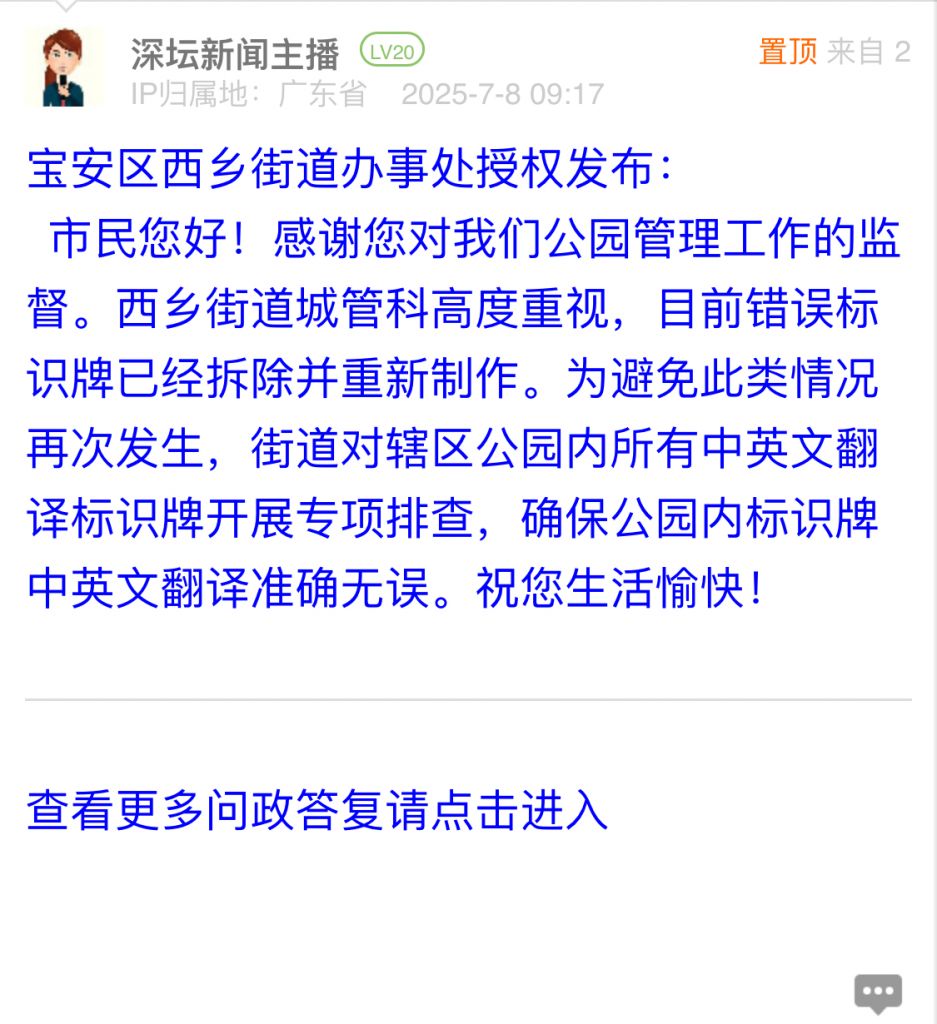 市民您好!感謝您對我們公園管理工作的監(jiān)督。西鄉(xiāng)街道城管科高度重視,目前錯誤標(biāo)識牌已經(jīng)拆除并重新制作。為避免此類情況再次發(fā)生,街道對轄區(qū)公園內(nèi)所有中英文翻譯標(biāo)識牌開展專項排查,確保公園內(nèi)標(biāo)識牌中英文翻譯準(zhǔn)確無誤。祝您生活愉快!