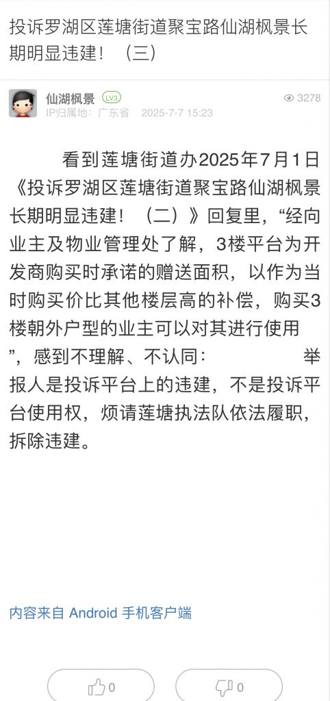 6. 帖文《投訴羅湖區(qū)蓮塘街道聚寶路仙湖楓景長期明顯違建?。ㄈ?/a>》