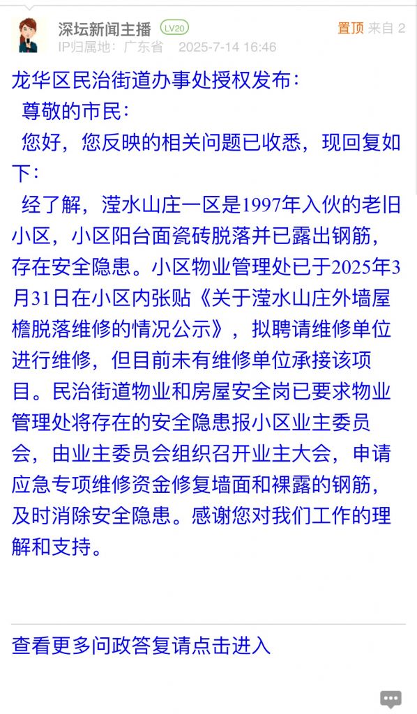 經(jīng)了解,瀅水山莊一區(qū)是1997年入伙的老舊小區(qū),小區(qū)陽臺面瓷磚脫落并已露出鋼筋,存在安全隱患。小區(qū)物業(yè)管理處已于2025年3月31日在小區(qū)內(nèi)張貼《關(guān)于瀅水山莊外墻屋檐脫落維修的情況公示》,擬聘請維修單位進(jìn)行維修,但目前未有維修單位承接該項目。民治街道物業(yè)和房屋安全崗已要求物業(yè)管理處將存在的安全隱患報小區(qū)業(yè)主委員會,由業(yè)主委員會組織召開業(yè)主大會,申請應(yīng)急專項維修資金修復(fù)墻面和裸露的鋼筋,及時消除安全隱患。感謝您對我們工作的理解和支持。