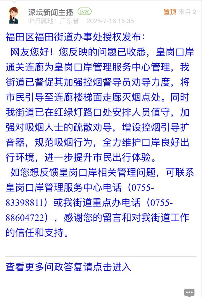 網(wǎng)友您好!您反映的問題已收悉,皇崗口岸通關(guān)連廊為皇崗口岸管理服務(wù)中心管理,我街道已督促其加強控?zé)煻綄?dǎo)員勸導(dǎo)力度,將市民引導(dǎo)至連廊樓梯面走廊滅煙點處。同時我街道已在紅綠燈路口處安排人員值守,加強對吸煙人士的疏散勸導(dǎo),增設(shè)控?zé)熞龑?dǎo)擴音器,規(guī)范吸煙行為,全力維護(hù)口岸良好出行環(huán)境,進(jìn)一步提升市民出行體驗。