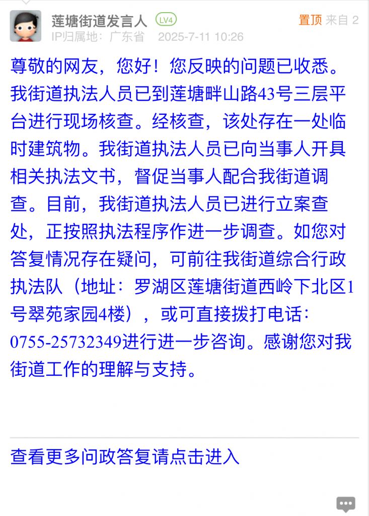 尊敬的網(wǎng)友,您好!您反映的問題已收悉。我街道執(zhí)法人員已到蓮塘畔山路43號三層平臺進(jìn)行現(xiàn)場核查。經(jīng)核查,該處存在一處臨時建筑物。我街道執(zhí)法人員已向當(dāng)事人開具相關(guān)執(zhí)法文書,督促當(dāng)事人配合我街道調(diào)查。目前,我街道執(zhí)法人員已進(jìn)行立案查處,正按照執(zhí)法程序作進(jìn)一步調(diào)查。如您對答復(fù)情況存在疑問,可前往我街道綜合行政執(zhí)法隊(地址:羅湖區(qū)蓮塘街道西嶺下北區(qū)1號翠苑家園4樓),或可直接撥打電話:0755-25732349進(jìn)行進(jìn)一步咨詢。感謝您對我街道工作的理解與支持。