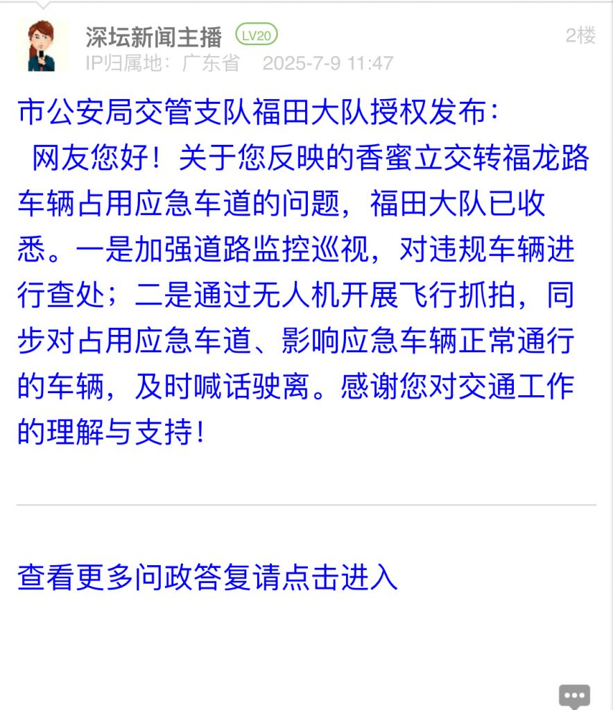 網(wǎng)友您好!關(guān)于您反映的香蜜立交轉(zhuǎn)福龍路車輛占用應(yīng)急車道的問題,福田大隊已收悉。一是加強道路監(jiān)控巡視,對違規(guī)車輛進(jìn)行查處;二是通過無人機開展飛行抓拍,同步對占用應(yīng)急車道、影響應(yīng)急車輛正常通行的車輛,及時喊話駛離。感謝您對交通工作的理解與支持!