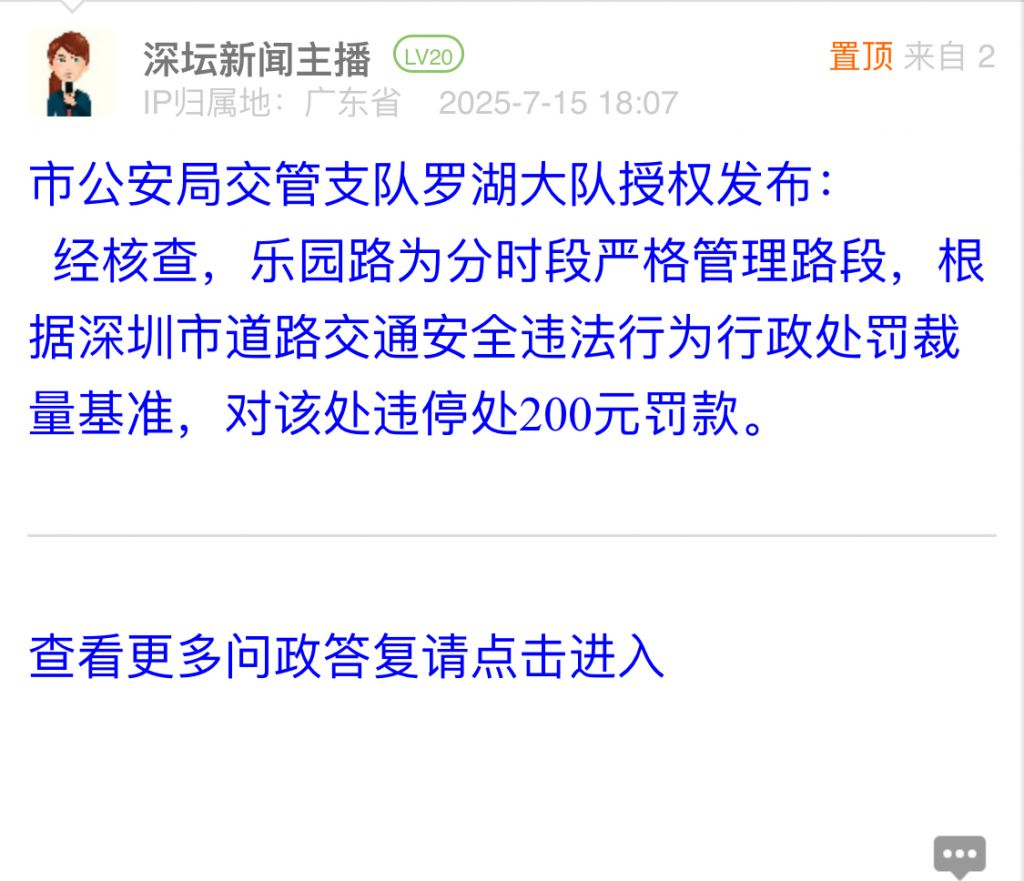 經(jīng)核查,樂園路為分時段嚴(yán)格管理路段,根據(jù)深圳市道路交通安全違法行為行政處罰裁量基準(zhǔn),對該處違停處200元罰款。