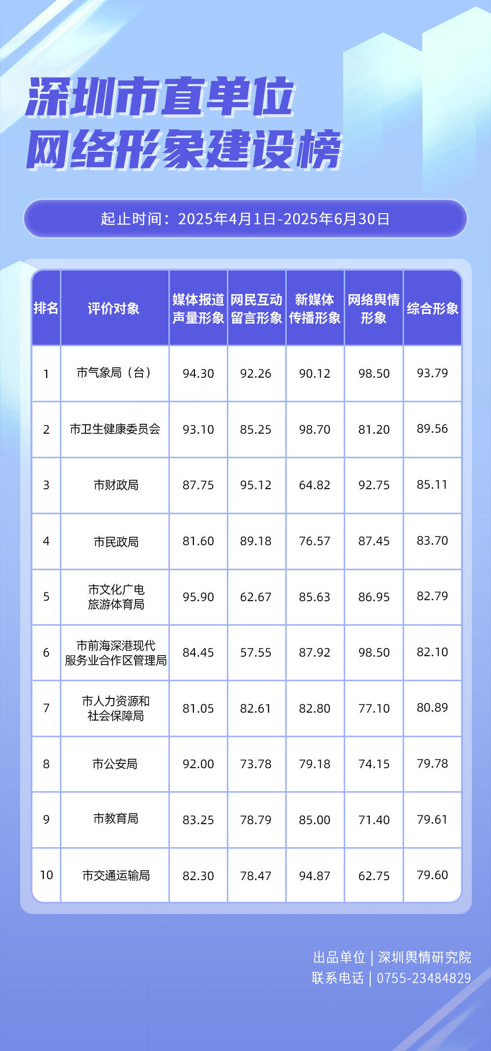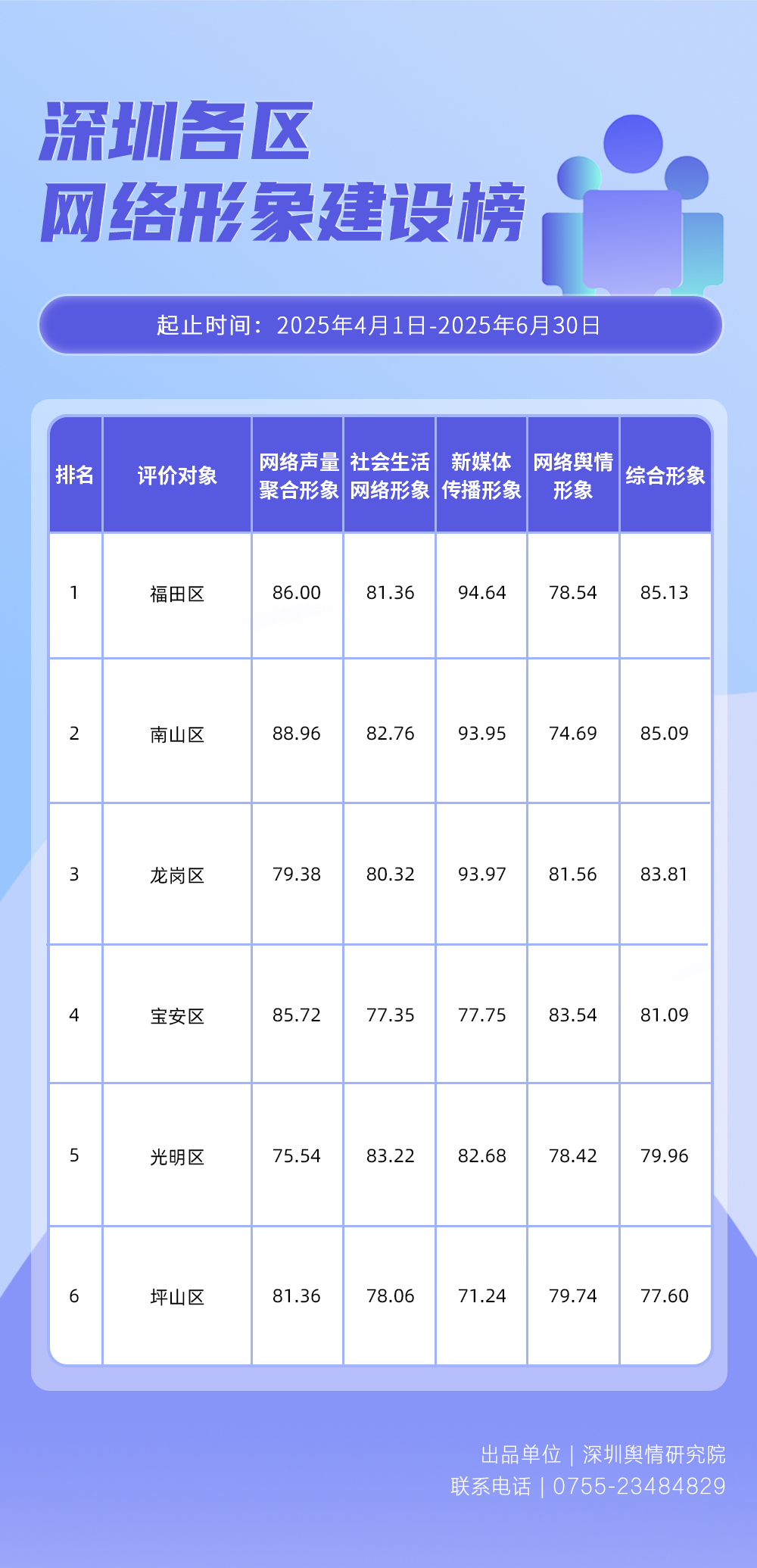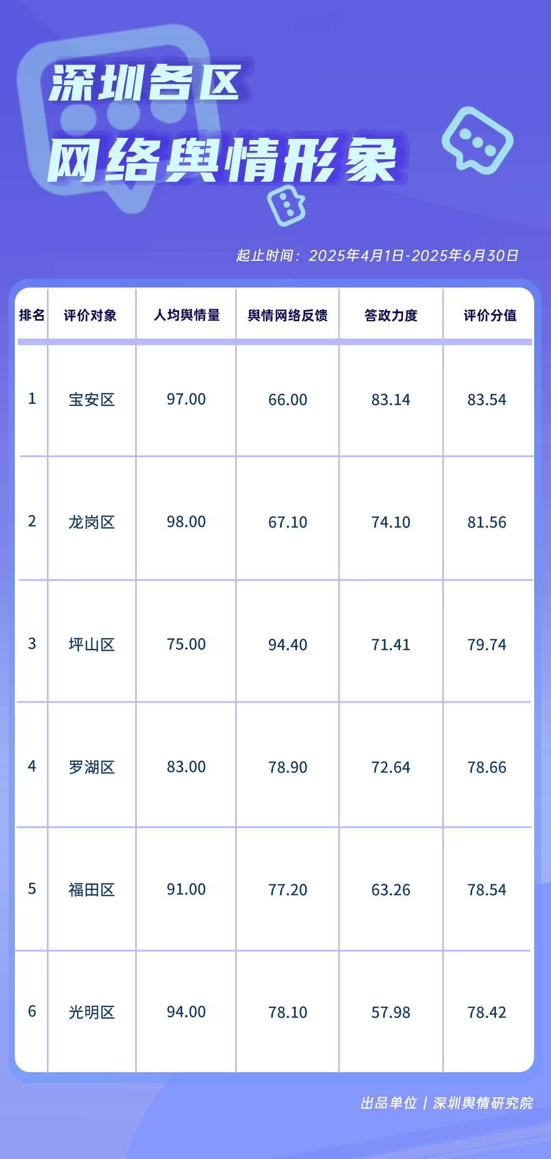 為全面評估深圳各區(qū)各單位網(wǎng)絡(luò)形象建設(shè)情況,助力各區(qū)各單位持續(xù)響應(yīng)居民對美好生活的期許,賦能城市高質(zhì)量發(fā)展,深圳輿情研究院推出“深圳各區(qū)各單位網(wǎng)絡(luò)形象建設(shè)榜”,從網(wǎng)絡(luò)聚合聲量、留言互動成效、社會生活評價、輿情管理能力及新媒體傳播水平等方面,多維度分析深圳各區(qū)(含大鵬新區(qū)、深汕特別合作區(qū))、各市直單位(市直屬單位、直屬部門)的網(wǎng)絡(luò)形象建設(shè)成果,凸顯各區(qū)各單位的“共性”與“個性”。