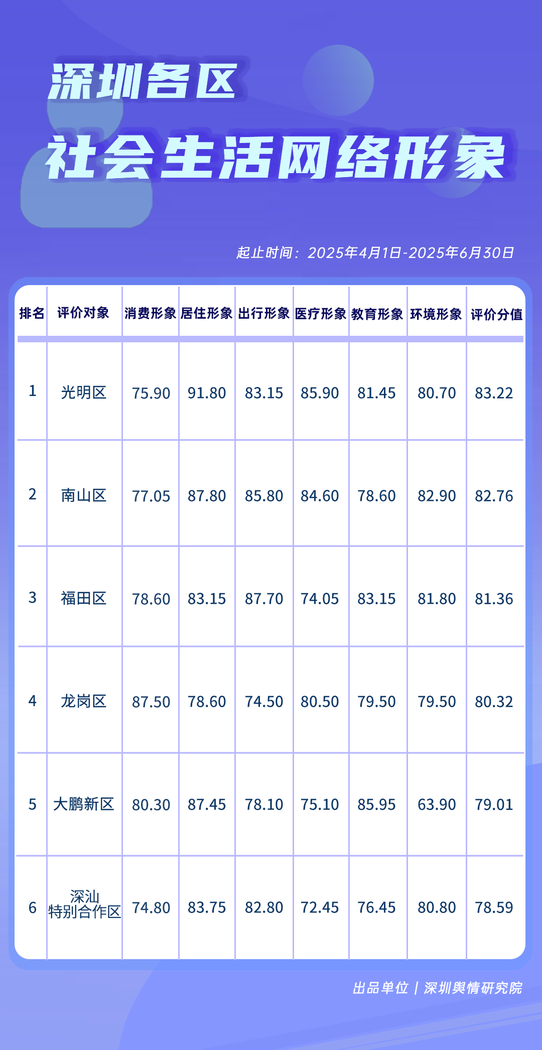 4-6月,《深圳各區(qū)社會生活網(wǎng)絡(luò)形象榜》中,光明區(qū)憑借在居住、醫(yī)療、出行等多方面的良好網(wǎng)絡(luò)呈現(xiàn),獲得較高綜合評價分值,南山區(qū)、福田區(qū)、龍崗區(qū)也表現(xiàn)優(yōu)異,四區(qū)綜合評價分值均超80分。大鵬新區(qū)、深汕特別合作區(qū)也在榜單中占據(jù)靠前位置,成為各區(qū)借助網(wǎng)絡(luò)力量增進(jìn)民生福祉、推動協(xié)調(diào)發(fā)展的生動展現(xiàn)。