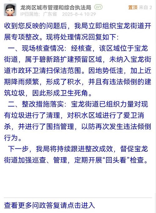 二、整改措施落實(shí):寶龍街道已組織力量對(duì)現(xiàn)有垃圾進(jìn)行了清理,對(duì)積水區(qū)域進(jìn)行了愛(ài)衛(wèi)消殺,并進(jìn)行了圍擋管理,以防再次發(fā)生違法傾倒行為。
