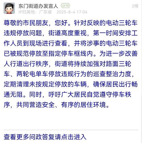 尊敬的市民朋友,您好。針對(duì)反映的電動(dòng)三輪車(chē)違規(guī)停放問(wèn)題,街道高度重視,第一時(shí)間安排工作人員到現(xiàn)場(chǎng)進(jìn)行查看,并將涉事的電動(dòng)三輪車(chē)已被規(guī)范停放至指定停車(chē)框線內(nèi)。為進(jìn)一步改善人行道出行秩序,街道將持續(xù)加強(qiáng)對(duì)路面三輪車(chē)、兩輪電單車(chē)停放違規(guī)行為的巡查整治力度,定期清理未按規(guī)定停放的車(chē)輛,確保居民出行暢通無(wú)阻。同時(shí),呼吁廣大居民自覺(jué)遵守停車(chē)秩序,共同營(yíng)造安全、有序的居住環(huán)境。