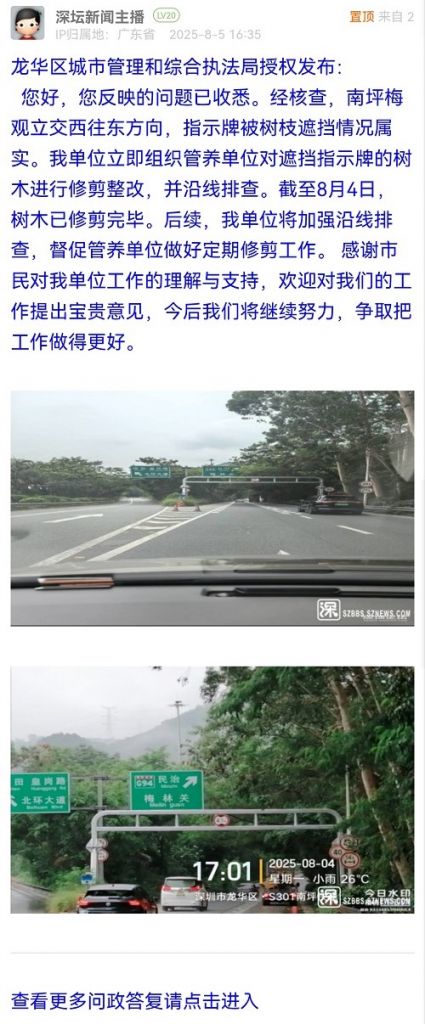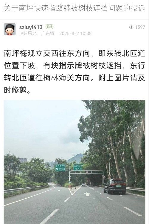 33. 帖文《關(guān)于南坪快速指路牌被樹(shù)枝遮擋問(wèn)題的投訴》