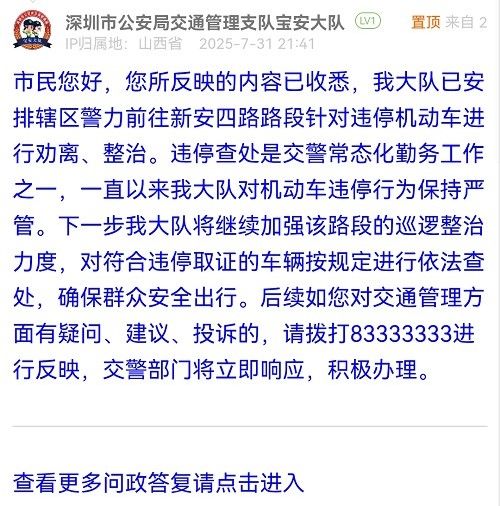 市民您好,您所反映的內(nèi)容已收悉,我大隊(duì)已安排轄區(qū)警力前往新安四路路段針對(duì)違停機(jī)動(dòng)車(chē)進(jìn)行勸離、整治。違停查處是交警常態(tài)化勤務(wù)工作之一,一直以來(lái)我大隊(duì)對(duì)機(jī)動(dòng)車(chē)違停行為保持嚴(yán)管。下一步我大隊(duì)將繼續(xù)加強(qiáng)該路段的巡邏整治力度,對(duì)符合違停取證的車(chē)輛按規(guī)定進(jìn)行依法查處,確保群眾安全出行。后續(xù)如您對(duì)交通管理方面有疑問(wèn)、建議、投訴的,請(qǐng)撥打83333333進(jìn)行反映,交警部門(mén)將立即響應(yīng),積極辦理。