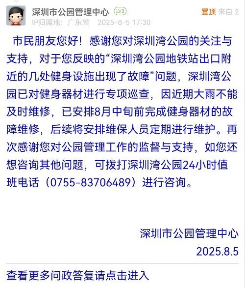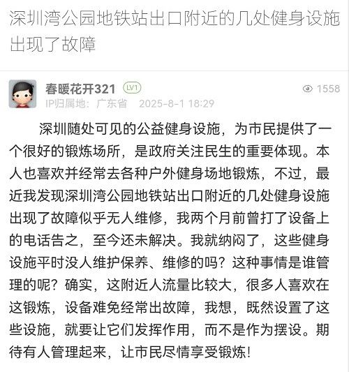 34. 帖文《深圳灣公園地鐵站出口附近的幾處健身設(shè)施出現(xiàn)了故障》