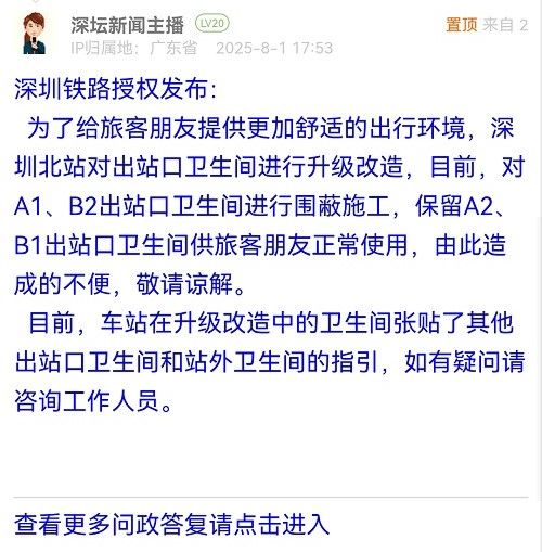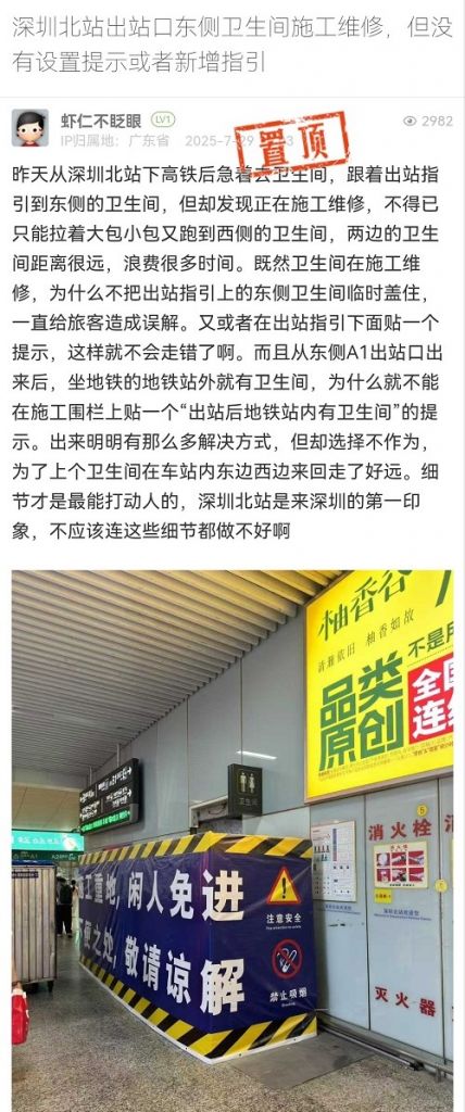 5. 帖文《深圳北站出站口東側(cè)衛(wèi)生間施工維修,但沒(méi)有設(shè)置提示或者新增指引》