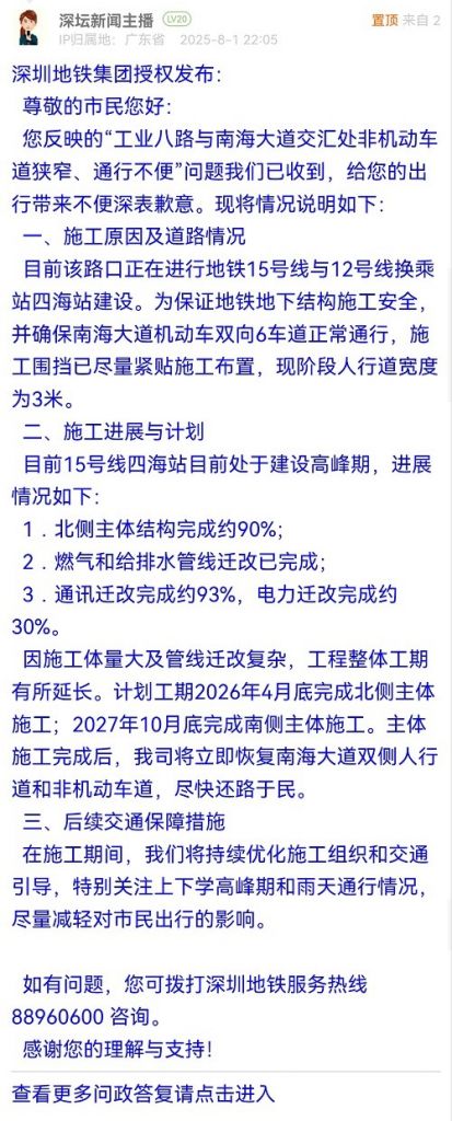 因施工體量大及管線遷改復(fù)雜,工程整體工期有所延長(zhǎng)。計(jì)劃工期2026年4月底完成北側(cè)主體施工;2027年10月底完成南側(cè)主體施工。主體施工完成后,我司將立即恢復(fù)南海大道雙側(cè)人行道和非機(jī)動(dòng)車(chē)道,盡快還路于民。