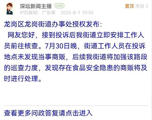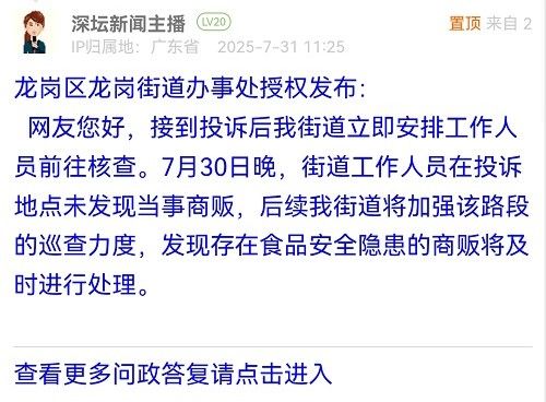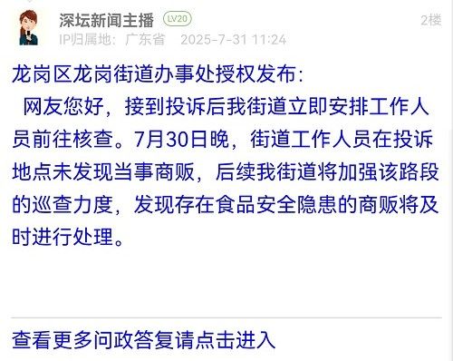 網(wǎng)友您好,接到投訴后我街道立即安排工作人員前往核查。7月30日晚,街道工作人員在投訴地點(diǎn)未發(fā)現(xiàn)當(dāng)事商販,后續(xù)我街道將加強(qiáng)該路段的巡查力度,發(fā)現(xiàn)存在食品安全隱患的商販將及時(shí)進(jìn)行處理。
