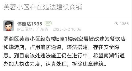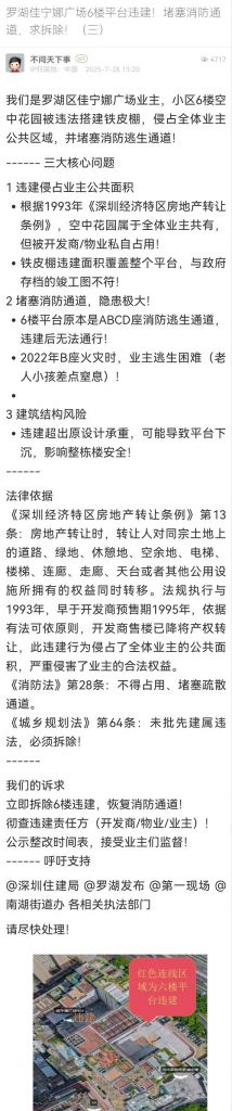 1. 帖文《羅湖佳寧娜廣場(chǎng)6樓平臺(tái)違建!堵塞消防通道,求拆除?。ㄈ?/a>》