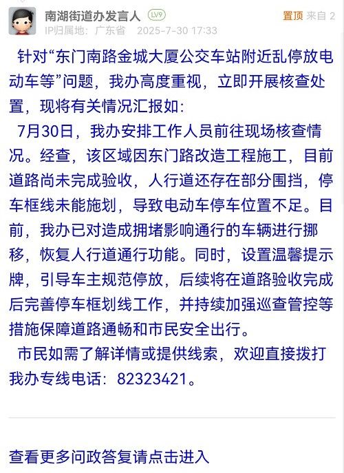7月30日,我辦安排工作人員前往現(xiàn)場(chǎng)核查情況。經(jīng)查,該區(qū)域因東門(mén)路改造工程施工,目前道路尚未完成驗(yàn)收,人行道還存在部分圍擋,停車(chē)框線未能施劃,導(dǎo)致電動(dòng)車(chē)停車(chē)位置不足。目前,我辦已對(duì)造成擁堵影響通行的車(chē)輛進(jìn)行挪移,恢復(fù)人行道通行功能。同時(shí),設(shè)置溫馨提示牌,引導(dǎo)車(chē)主規(guī)范停放,后續(xù)將在道路驗(yàn)收完成后完善停車(chē)框劃線工作,并持續(xù)加強(qiáng)巡查管控等措施保障道路通暢和市民安全出行。