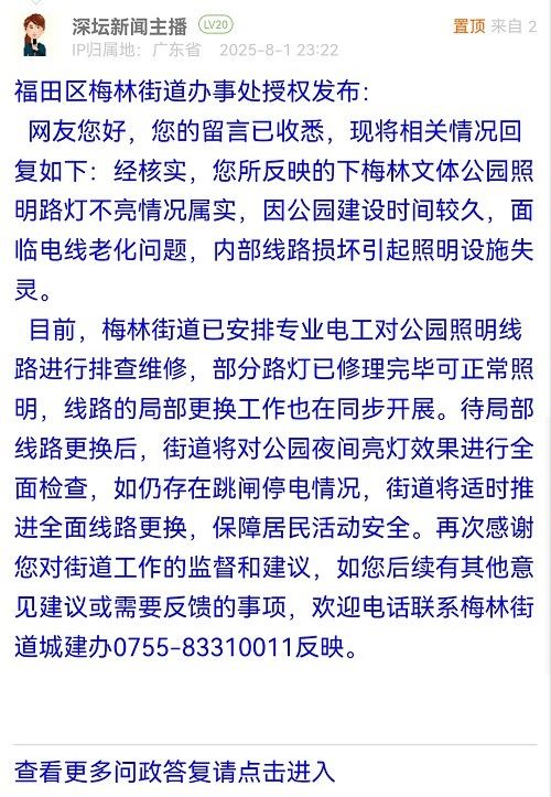 目前,梅林街道已安排專(zhuān)業(yè)電工對(duì)公園照明線路進(jìn)行排查維修,部分路燈已修理完畢可正常照明,線路的局部更換工作也在同步開(kāi)展。待局部線路更換后,街道將對(duì)公園夜間亮燈效果進(jìn)行全面檢查,如仍存在跳閘停電情況,街道將適時(shí)推進(jìn)全面線路更換,保障居民活動(dòng)安全。再次感謝您對(duì)街道工作的監(jiān)督和建議,如您后續(xù)有其他意見(jiàn)建議或需要反饋的事項(xiàng),歡迎電話聯(lián)系梅林街道城建辦0755-83310011反映。