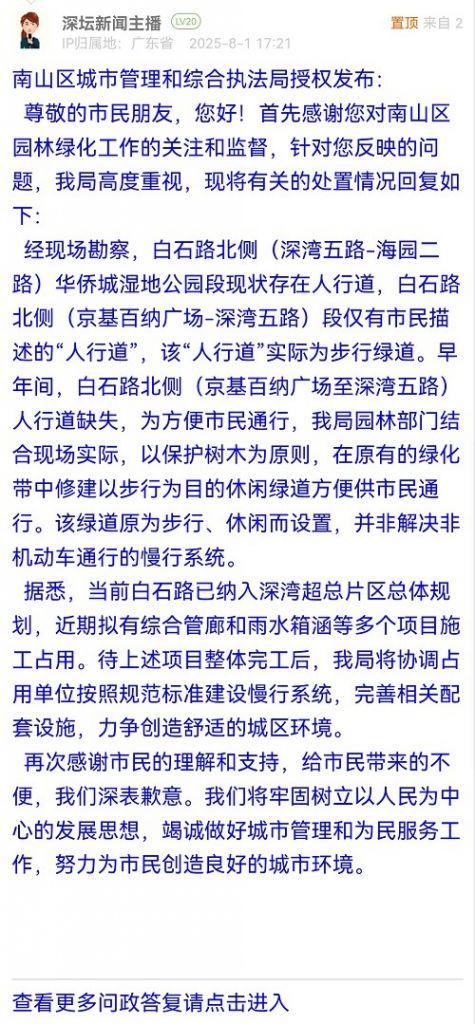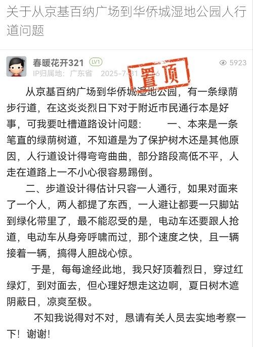 20. 帖文《關(guān)于從京基百納廣場(chǎng)到華僑城濕地公園人行道問(wèn)題》