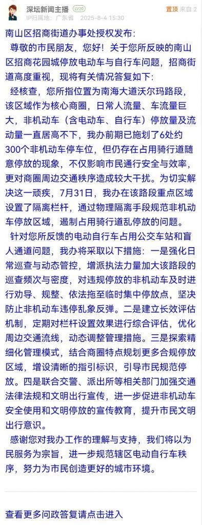 25. 帖文《南山區(qū)招商花園城停放電動(dòng)車(chē)與自行車(chē)問(wèn)題》