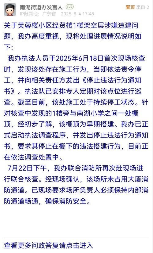 我辦執(zhí)法人員于2025年6月18日首次現(xiàn)場(chǎng)核查時(shí),發(fā)現(xiàn)該處存在施工行為,當(dāng)即依法責(zé)令停工,并向相關(guān)責(zé)任方發(fā)出《停止違法行為通知書(shū)》。執(zhí)法隊(duì)已安排專(zhuān)人定期對(duì)該點(diǎn)位進(jìn)行巡查。截至目前,該處施工處于持續(xù)停工狀態(tài)。針對(duì)核查中發(fā)現(xiàn)的1樓旁與南湖小學(xué)之間一處棚頂,經(jīng)初步了解,該棚頂為早期搭建。我辦已正式啟動(dòng)執(zhí)法調(diào)查程序,并發(fā)出停止違法行為通知書(shū),要求其停止在棚下的違法搭建行為,目前正在依法調(diào)查處置中。