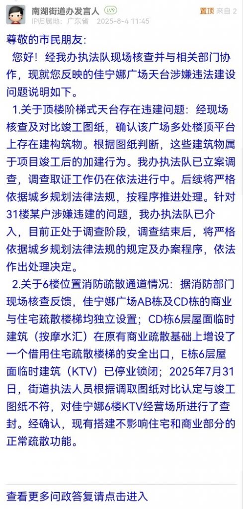 2.關(guān)于6樓位置消防疏散通道情況:據(jù)消防部門(mén)現(xiàn)場(chǎng)核查反饋,佳寧娜廣場(chǎng)AB棟及CD棟的商業(yè)與住宅疏散樓梯均獨(dú)立設(shè)置;CD棟6層屋面臨時(shí)建筑(按摩水匯)在原有商業(yè)疏散基礎(chǔ)上增設(shè)了一個(gè)借用住宅疏散樓梯的安全出口,E棟6層屋面臨時(shí)建筑(KTV)已停業(yè)鎖閉;2025年7月31日,街道執(zhí)法人員根據(jù)調(diào)取圖紙對(duì)比認(rèn)定與竣工圖紙不符,對(duì)佳寧娜6樓KTV經(jīng)營(yíng)場(chǎng)所進(jìn)行了查封。經(jīng)確認(rèn),現(xiàn)有搭建不影響住宅和商業(yè)部分的正常疏散功能。