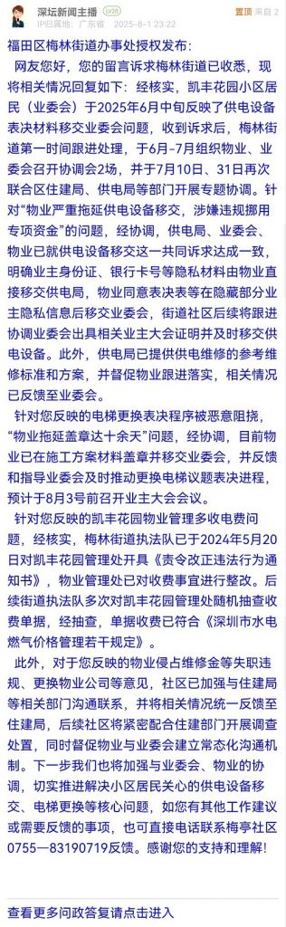 此外,對(duì)于您反映的物業(yè)侵占維修金等失職違規(guī)、更換物業(yè)公司等意見(jiàn),社區(qū)已加強(qiáng)與住建局等相關(guān)部門(mén)溝通聯(lián)系,并將相關(guān)情況統(tǒng)一反饋至住建局,后續(xù)社區(qū)將緊密配合住建部門(mén)開(kāi)展調(diào)查處置,同時(shí)督促物業(yè)與業(yè)委會(huì)建立常態(tài)化溝通機(jī)制。下一步我們也將加強(qiáng)與業(yè)委會(huì)、物業(yè)的協(xié)調(diào),切實(shí)推進(jìn)解決小區(qū)居民關(guān)心的供電設(shè)備移交、電梯更換等核心問(wèn)題,如您有其他工作建議或需要反饋的事項(xiàng),也可直接電話聯(lián)系梅亭社區(qū)0755—83190719反饋。感謝您的支持和理解!