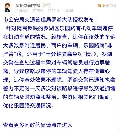 針對(duì)網(wǎng)民反映的羅湖區(qū)樂(lè)園路有機(jī)動(dòng)車(chē)輛違停在機(jī)動(dòng)車(chē)道的情況。經(jīng)核查,違停在該處的車(chē)輛大多數(shù)系附近居民、商戶的車(chē)輛,樂(lè)園路屬“非嚴(yán)管”路,適用于“十分鐘駛離免罰”情形,羅湖交警在查處過(guò)程中需對(duì)車(chē)輛駕駛員進(jìn)行勸導(dǎo)駛離,導(dǎo)致該路段違停的車(chē)輛駕駛?cè)舜嬖趦e幸心理,違停查處效果不理想。羅湖交警已通知執(zhí)勤警力不定時(shí)一天多次對(duì)該路段違停導(dǎo)致交通擁堵的車(chē)輛及時(shí)勸離和整治。將協(xié)同相關(guān)部門(mén)調(diào)研,優(yōu)化樂(lè)園路交通情況。
