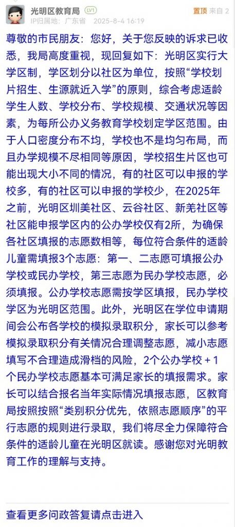 尊敬的市民朋友:您好,關(guān)于您反映的訴求已收悉,我局高度重視,現(xiàn)回復(fù)如下:光明區(qū)實(shí)行大學(xué)區(qū)制,學(xué)區(qū)劃分以社區(qū)為單位,按照“學(xué)校劃片招生、生源就近入學(xué)”的原則,綜合考慮適齡學(xué)生人數(shù)、學(xué)校分布、學(xué)校規(guī)模、交通狀況等因素,為每所公辦義務(wù)教育學(xué)校劃定學(xué)區(qū)范圍。由于人口密度分布不均,學(xué)校也不是均勻布局,而且辦學(xué)規(guī)模不盡相同等原因,學(xué)校招生片區(qū)也可能出現(xiàn)大小不同的情況,有的社區(qū)可以申報(bào)的學(xué)校多,有的社區(qū)可以申報(bào)的學(xué)校少,在2025年之前,光明區(qū)圳美社區(qū)、云谷社區(qū)、新羌社區(qū)等社區(qū)能申報(bào)學(xué)區(qū)內(nèi)的公辦學(xué)校僅有2所,為確保各社區(qū)填報(bào)的志愿數(shù)相等,每位符合條件的適齡兒童需填報(bào)3個(gè)志愿:第一、二志愿可填報(bào)公辦學(xué)?;蛎褶k學(xué)校,第三志愿為民辦學(xué)校志愿,必須填報(bào)。公辦學(xué)校志愿需按學(xué)區(qū)填報(bào),民辦學(xué)校學(xué)區(qū)為光明區(qū)范圍。此外,光明區(qū)在學(xué)位申請(qǐng)期間會(huì)公布各學(xué)校的模擬錄取積分,家長(zhǎng)可以參考模擬錄取積分有關(guān)情況合理調(diào)整志愿,減小志愿填寫(xiě)不合理造成滑檔的風(fēng)險(xiǎn),2個(gè)公辦學(xué)校+1個(gè)民辦學(xué)校志愿基本可滿足家長(zhǎng)的填報(bào)需求。家長(zhǎng)可以結(jié)合報(bào)名當(dāng)年實(shí)際情況填報(bào)志愿,區(qū)教育局按照按照“類(lèi)別積分優(yōu)先,依照志愿順序”的平行志愿的規(guī)則進(jìn)行錄取,我們將盡全力保障符合條件的適齡兒童在光明區(qū)就讀。感謝您對(duì)光明教育工作的理解與支持。