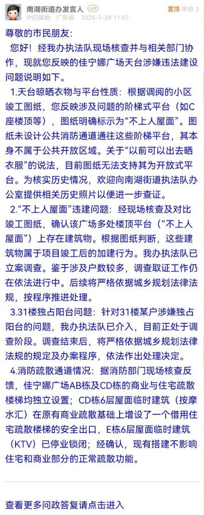 1.關(guān)于頂樓階梯式天臺(tái)存在違建問(wèn)題:經(jīng)現(xiàn)場(chǎng)核查及對(duì)比竣工圖紙,確認(rèn)該廣場(chǎng)多處樓頂平臺(tái)上存在建構(gòu)筑物。根據(jù)圖紙判斷,這些建筑物屬于項(xiàng)目竣工后的加建行為。我辦執(zhí)法隊(duì)已立案調(diào)查,調(diào)查取證工作仍在依法進(jìn)行中。后續(xù)將嚴(yán)格依據(jù)城鄉(xiāng)規(guī)劃法律法規(guī),按程序推進(jìn)處理。針對(duì)31樓某戶涉嫌違建的問(wèn)題,我辦執(zhí)法隊(duì)已介入,目前正處于調(diào)查階段,調(diào)查結(jié)束后,將嚴(yán)格依據(jù)城鄉(xiāng)規(guī)劃法律法規(guī)的規(guī)定及辦案程序,依法作出處理決定。