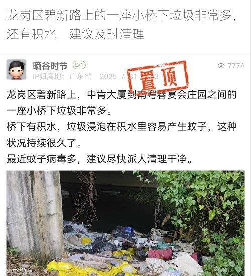 19. 帖文《龍崗區(qū)碧新路上的一座小橋下垃圾非常多,還有積水,建議及時(shí)清理》