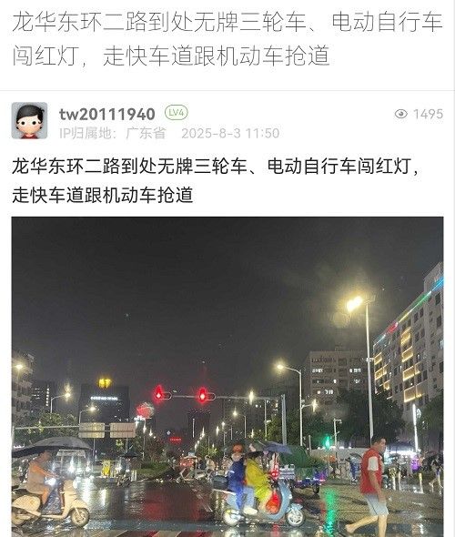 31. 帖文《龍華東環(huán)二路到處無(wú)牌三輪車(chē)、電動(dòng)自行車(chē)闖紅燈,走快車(chē)道跟機(jī)動(dòng)車(chē)搶道》