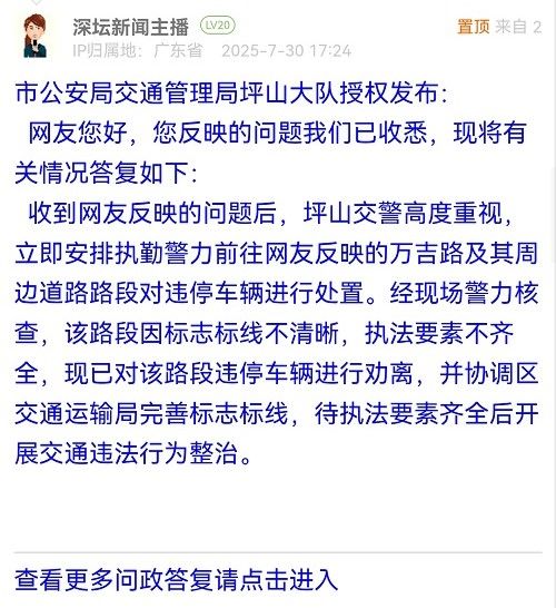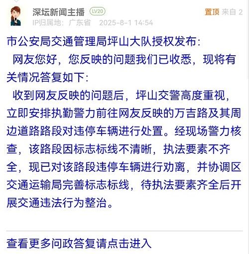 收到網(wǎng)友反映的問(wèn)題后,坪山交警高度重視,立即安排執(zhí)勤警力前往網(wǎng)友反映的萬(wàn)吉路及其周邊道路路段對(duì)違停車(chē)輛進(jìn)行處置。經(jīng)現(xiàn)場(chǎng)警力核查,該路段因標(biāo)志標(biāo)線不清晰,執(zhí)法要素不齊全,現(xiàn)已對(duì)該路段違停車(chē)輛進(jìn)行勸離,并協(xié)調(diào)區(qū)交通運(yùn)輸局完善標(biāo)志標(biāo)線,待執(zhí)法要素齊全后開(kāi)展交通違法行為整治。