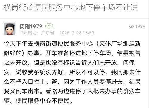 2. 帖文《橫崗街道便民服務(wù)中心地下停車(chē)場(chǎng)不讓進(jìn)》