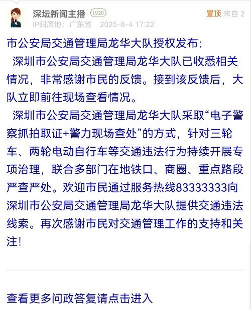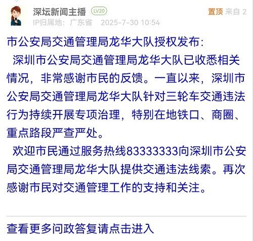 深圳市公安局交通管理局龍華大隊(duì)已收悉相關(guān)情況,非常感謝市民的反饋。一直以來(lái),深圳市公安局交通管理局龍華大隊(duì)針對(duì)三輪車(chē)交通違法行為持續(xù)開(kāi)展專(zhuān)項(xiàng)治理,特別在地鐵口、商圈、重點(diǎn)路段嚴(yán)查嚴(yán)處。