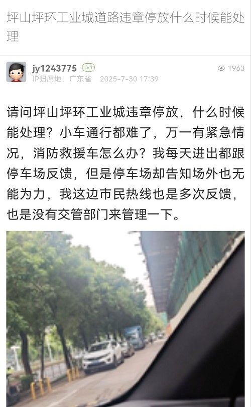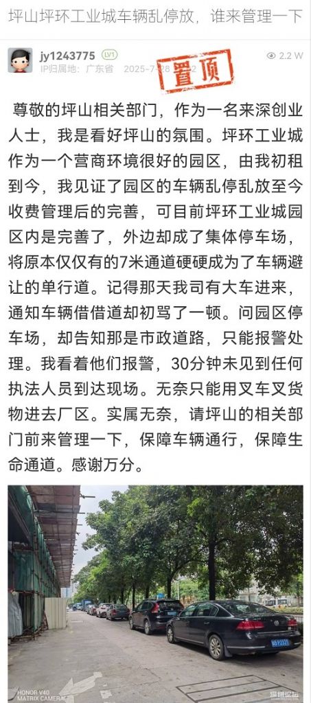 4. 帖文《坪山坪環(huán)工業(yè)城車(chē)輛亂停放,誰(shuí)來(lái)管理一下》