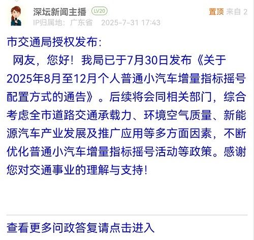 網(wǎng)友,您好!我局已于7月30日發(fā)布《關(guān)于2025年8月至12月個(gè)人普通小汽車(chē)增量指標(biāo)搖號(hào)配置方式的通告》。后續(xù)將會(huì)同相關(guān)部門(mén),綜合考慮全市道路交通承載力、環(huán)境空氣質(zhì)量、新能源汽車(chē)產(chǎn)業(yè)發(fā)展及推廣應(yīng)用等多方面因素,不斷優(yōu)化普通小汽車(chē)增量指標(biāo)搖號(hào)活動(dòng)等政策。感謝您對(duì)交通事業(yè)的理解與支持!