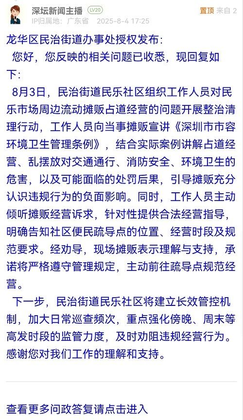 下一步,民治街道民樂(lè)社區(qū)將建立長(zhǎng)效管控機(jī)制,加大日常巡查頻次,重點(diǎn)強(qiáng)化傍晚、周末等高發(fā)時(shí)段的監(jiān)管力度,及時(shí)勸阻違規(guī)經(jīng)營(yíng)行為。感謝您對(duì)我們工作的理解和支持。