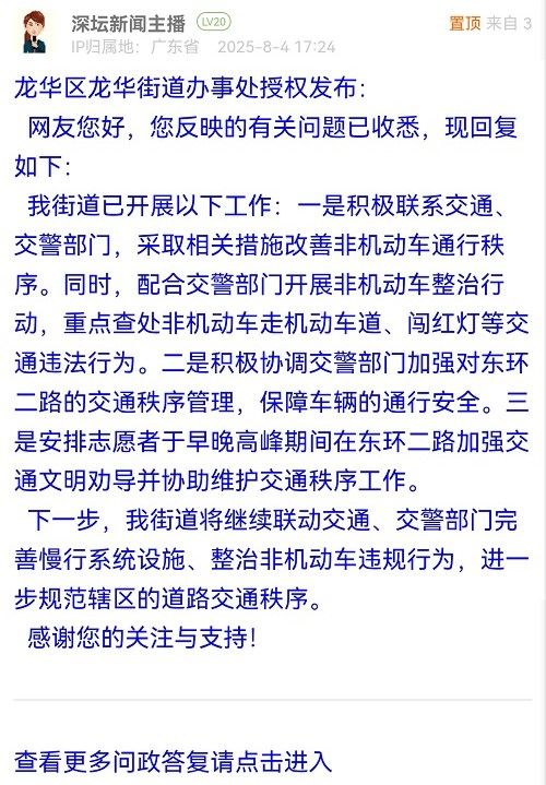 深圳市公安局交通管理局龍華大隊(duì)已收悉相關(guān)情況,非常感謝市民的反饋。接到該反饋后,大隊(duì)立即前往現(xiàn)場(chǎng)查看情況。