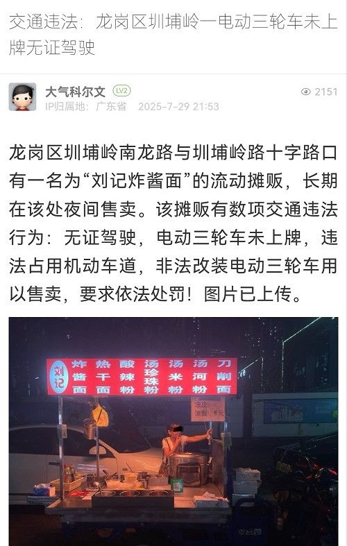 8. 帖文《交通違法:龍崗區(qū)圳埔?guī)X一電動(dòng)三輪車(chē)未上牌無(wú)證駕駛》